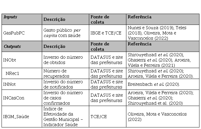 As variáveis mostradas no Quadro 1 foram utilizadas para o cálculo da eficiência dos municípios da região metropolitana do Cariri no enfrentamento à pandemia da COVID-19, com suporte do software Frontier Analyst 4.