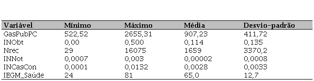 Inicialmente foi realizada a análise descritiva das variáveis. Esse tipo de abordagem possibilita uma melhor compreensão do comportamento dos dados, identificando-se tendências, variabilidade e valores atípicos (Fávero et al., 2009). A Tabela 1 descreve a estatística descritiva de cada variável utilizada no estudo.