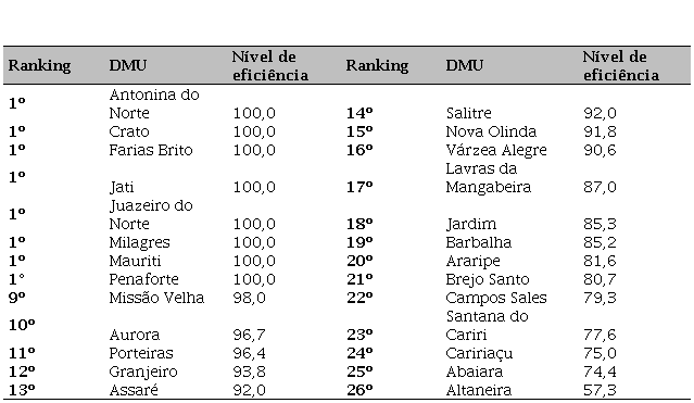 Methodology: To calculate the efficiency of the 26 municipalities, the Data Wrap Analysis (DEA) was used, using the BCC (Banker-Charnes-Cooper) model, with orientation towards outputs.