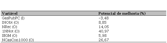 A DEA também possibilita identificar os potenciais de melhoria, ou seja, as medidas que precisam ser implementadas para que as unidades classificadas como ineficientes possam atingir a fronteira de eficiência. A Tabela 3 mostra, em porcentagens, os potenciais de melhoria de toda a amostra.
