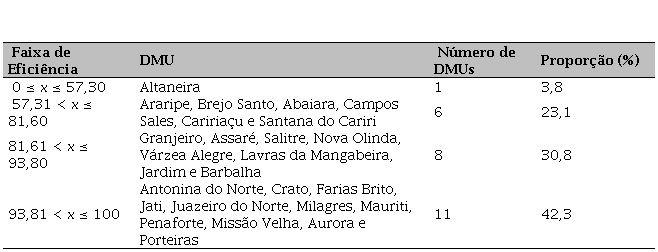 A distribuição das DMUs por nível de eficiência (Tabela 4) evidencia uma maior concentração de municípios na última faixa (11), seguindo-se o segundo grupo (8) e o terceiro (6). Apenas Altaneira foi classificada na última faixa. As principais causas são o número de mortes, notificações e confirmações, além da variável IEGM_Saúde, pois ela apresentou um índice de apenas 41 pontos.