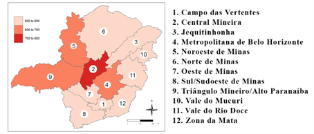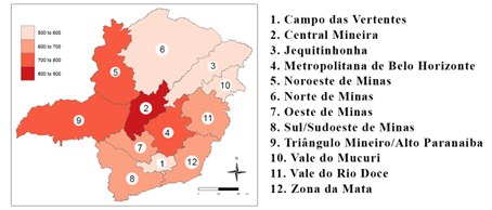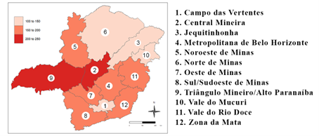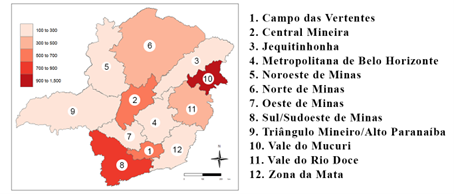 Como complemento às estatísticas descritivas, as Figuras 1, 2 e 3, abaixo, apresentam, respectivamente, os gastos per capita em educação em 2000 e 2004, além das taxas de crimes violentos em 2005 nas mesorregiões de Minas Gerais. Para a elaboração das figuras, os municípios mineiros foram agrupados em suas respectivas mesorregiões e foi calculada a média das variáveis de interesse, gastos per capita em educação e taxas de crimes violentos, sendo considerado, assim, cinco períodos de defasagem na Figura 1 e um período na Figura 2. O agrupamento dos municípios em mesorregiões facilita a observação e apresentação dos gastos em educação e das taxas de delitos, distribuídos em Minas Gerais. Segundo a teoria da Economia Regional, municípios próximos têm mais características em comum com seus vizinhos em relação aos municípios mais distantes (Lima & Simões, 2009).