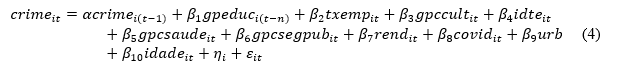Resultados: Verificou-se existência de relação inversa entre gastos per capita em educação, defasados em três, quatro e cinco períodos, sobre as taxas de crimes violentos, sendo que o efeito com maior magnitude foi relativo a cinco defasagens. Além disso, foi encontrado que os crimes violentos são, em geral, cometidos pela parcela mais jovem dos municípios e em regiões com maior nível de atividade econômica. Ademais, notou-se que os crimes cometidos no passado influenciam aqueles notificados no período contemporâneo e a pandemia da COVID-19 afetou a atuação dos criminosos, reduzindo as taxas de criminalidade.