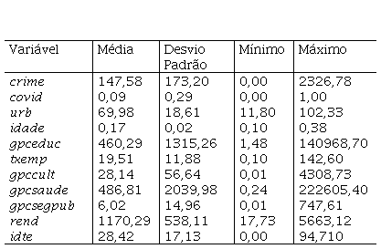 É possível constatar que algumas variáveis apresentaram elevada discrepância, sendo os desvios padrões mais elevados que suas médias, com destaque para as taxas de crimes violentos, gastos per capita em educação, gastos per capita em saúde e gastos per capita em segurança pública.