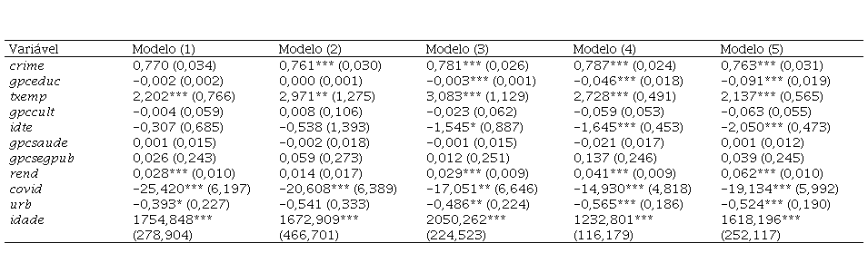 De maneira complementar, também foi encontrado coeficiente estimado positivo e significativo para a variável relacionada ao nível de emprego no setor formal. Isso corrobora a interpretação do resultado para a variável de rendimento médio, já que em regiões com nível mais elevado de atividade econômica, maiores tendem a ser as taxas de emprego, dada a necessidade de mão de obra. Logo, em regiões com maiores níveis de crimes economicamente motivados, a exemplo de alguns considerados na taxa de crimes violentos, tais como roubos, extorsão e sequestro, sua atratividade é mais elevada, em virtude dos possíveis retornos esperados.