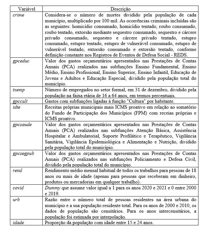 Não obstante, tendo como parâmetro a literatura relativa ao tema, foram inseridos os seguintes controles adicionais: taxa de emprego no setor formal (txemp), taxa de urbanização (urb), proporção da população entre 15 e 24 anos (idade), percentual do investimento em relação à despesa total (invest), Índice de Desenvolvimento Tributário e Econômico (idte), dummy para o período de pandemia da COVID-19 (covid), gastos per capita com difusão cultural (gpccult), rendimento médio do setor formal (rend), gastos per capita com saúde (gpcsaude) e gastos per capita em segurança pública (gpcsegpub). Os três últimos controles foram considerados endógenos na estimação em função da relação de simultaneidade com a variável dependente, constatada vide Teste de Durbin-Wu-Hausman. Outros estudos, a exemplo de Ullah, Akhtar e Zaefarian (2018), atestam a utilização desse teste para verificar a endogeneidade em modelos com dados em painel dinâmico. Outrossim, importante destacar que todas as variáveis monetárias foram deflacionadas segundo o Índice Nacional de Preços ao Consumidor Amplo (INPC), tendo como base o último ano da série, 2021.