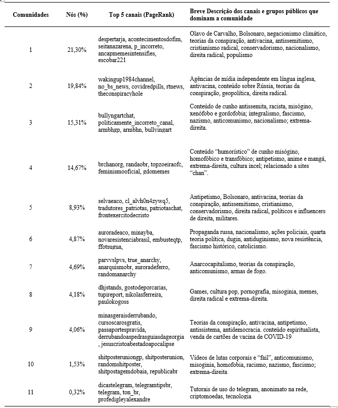 A análise dos dados apresentada na Tabela 1 revelou a existência de 11 comunidades distintas, que demonstram características de recortes ideológicos e linguísticos. A maior comunidade identificada, rotulada como grupo 1, engloba um total de 1212 canais ou grupos, que apresentam conteúdos alinhados com o que denominamos direita radical, sobretudo em sua vertente populista. Este grupo é caracterizado pela concepção da sociedade como estratificada em duas categorias opostas, sendo elas, pessoas puras e elite corrupta. A prática política, neste caso, seria a expressão dos anseios e desejos deste primeiro grupo, com a ampla disseminação de teorias da conspiração sendo uma de suas principais marcas (Mudde, 2019).