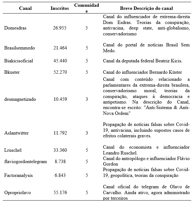 Além disso, é importante mencionar que 6 dos 8 canais mais importantes desta comunidade estão ligados a influenciadores digitais da extrema-direita no Brasil. Ademais, um desses canais é um portal de notícias que foi fundado por uma das personalidades que aparece no Quadro 2. Essa descoberta indica que o papel desempenhado por essas figuras públicas, no contexto da rede do Telegram, é essencialmente de atuar como conectores entre as diferentes comunidades.