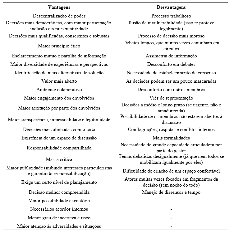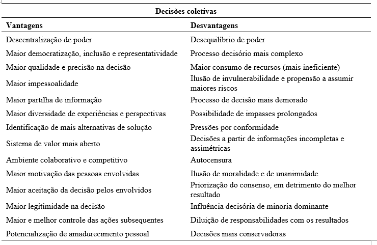 Apesar de compreender diversos tipos de vantagens como, por exemplo, maior diversidade de informações para subsídio da decisão e descentralização de poder, esse modelo decisório também possui desvantagens, como a propensão para assumir maiores riscos, explicado pela distribuição desses riscos e a limitada possibilidade de tomada de decisão com maior celeridade, já que se fazem necessários debates, quórum mínimo, bem como o já mencionado consenso entre os envolvidos (Sobral & Peci, 2013). O quadro 1 apresenta algumas vantagens e desvantagens encontradas na literatura acerca da tomada de decisão coletiva.