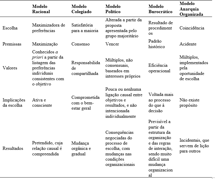 Assim, a tomada de decisão coletiva tem se tornado cada vez mais usual nas organizações, uma vez que permite a integração de diferentes perspectivas, uma maior descentralização de poder e o compartilhamento de responsabilidades (Almeida & Morais, 2021). Entende-se como decisão coletiva o resultado de um processo de negociação de um grupo, realizado de forma racional, colegiada, política, burocrática, ou anarquicamente organizada, para a definição de uma ação (Almeida & Morais, 2021; Chaffee, 1983; Melo, 1991; Souto-Maior, 1988). Esses diferentes modelos de tomada de decisão se diferem quanto ao método de escolha das alternativas, premissas, valores, implicações e resultados por eles possibilitados (Chaffee, 1983), particularidades que lhes tornam dignos de análise e melhor compreensão.