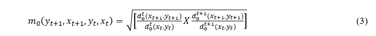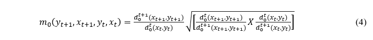 Onde a notação dt0(xt+1, yt+1) representa a distância da observação da tecnologia do período t+1 até do período t. A equação 3 representa a produtividade do ponto de produção xt+1 e yt+1 em relação ao ponto de produção xt e yt. Um valor maior que 1 indica crescimento positivo da produtividade do período t para o período t+1. Este índice é a média geométrica de dois índices de Malmquist baseados na produtividade (Coelli et al., 2005). Uma maneira equivalente de escrever esse índice de produtividade é
