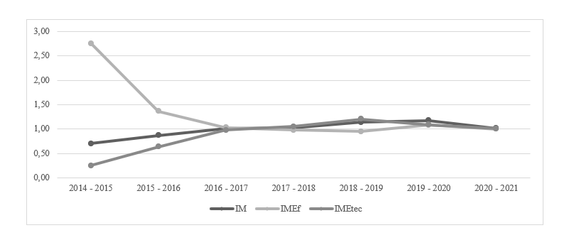 Assim como o IM, um valor acima de 1 indica um aumento do IMEf e do IMEtec do período t para o período t+1. Quando o valor se mantém em 1 indica que não houve alteração, e quando menor que 1 indica uma diminuição dos índices.