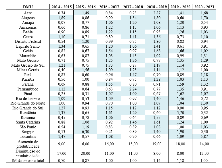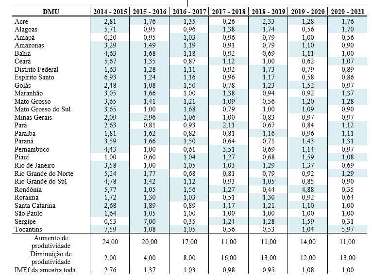 Vale destacar o IM do estado de Sergipe no período de 2015 a 2016, que é de 6,30. A Tabela 2 mostra que essa DMU varia de um índice de eficiência de 0,31 em 2015 para um índice de eficiência de 1 em 2016. Da mesma forma, o estado do Tocantins, cujo IM foi 5,87 no período de 2020 a 2021, apresentou um índice de eficiência de 0,32 em 2020 e está na fronteira de eficiência em 2021.