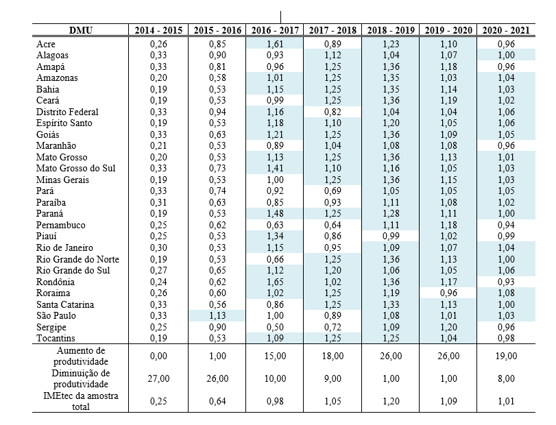 Entre 2014-2015, 24 DMUs apresentaram um aumento no IMEf, enquanto apenas 2 DMUs mostraram uma diminuição. Em contraste, de 2020-2021, apenas 11 DMUs melhoraram o IMEf, enquanto 13 DMUs apresentaram uma queda. Ao analisar o IMEtec, todas as DMUs exibiram uma redução nesse indicador de 2014 a 2015, e apenas uma DMU demonstrou um aumento na produtividade tecnológica no período de 2015 a 2016 (São Paulo). No entanto, de 2016 a 2017, houve um aumento considerável nas DMUs com melhoria na produtividade tecnológica, segundo o IMEtec, com um número crescente de DMUs experimentando melhorias na mudança tecnológica em cada período subsequente, atingindo seu pico no último período, de 2020 a 2021.