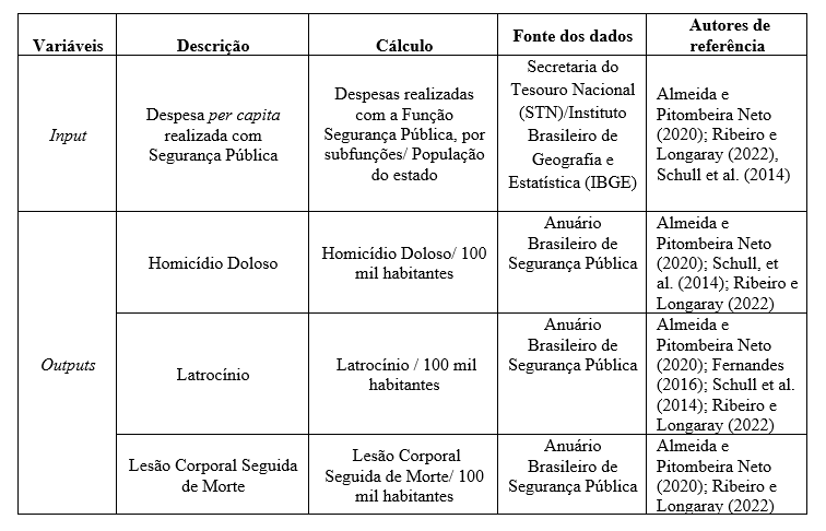 Para calcular os níveis de eficiência das DMUs, foram considerados os 26 estados do Brasil, além do Distrito Federal. O input utilizado foi a despesa per capita destinada à segurança pública. No que concerne aos outputs, foram incluídos exclusivamente os Crimes Violentos Letais Intencionais (CVLI), definidos como homicídios dolosos, latrocínios e lesões corporais seguidas de morte, uma vez que estes são os crimes com resultados mais graves e, portanto, podem representar de maneira adequada os índices gerais de violência (Almeida, 2016). Ressalta-se que foram utilizadas as variáveis que compõem o indicador de CVLI de forma separada. Utilizou-se a razão entre o número de ocorrências de CVLI por 100 mil habitantes em cada estado. Foi necessário empregar o inverso das taxas de CVLI, uma vez que o modelo DEA interpreta que quanto maior o resultado, maior é o nível de eficiência da DMU. No entanto, para interpretar as taxas de crimes, entende-se que a eficiência está associada a um menor índice de CVLI, ou seja, as variáveis que compõem o CVLI são consideradas variáveis indesejáveis, conforme Lins e Meza (2000).