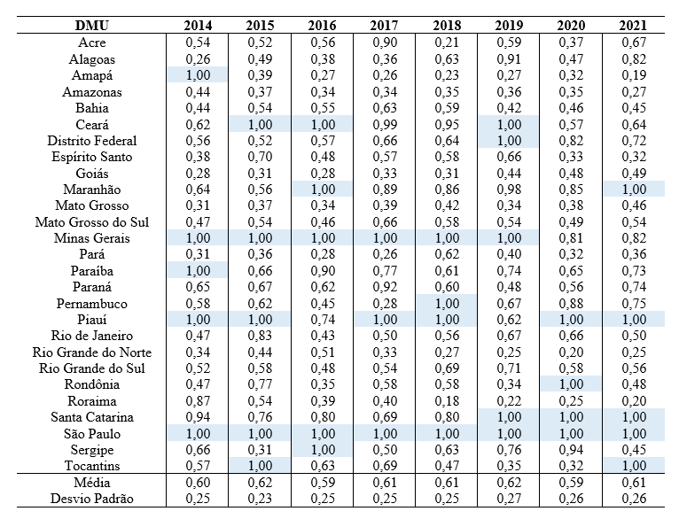 Minas Gerais foi eficiente de 2014 a 2019, mas perdeu seu status de referência em 2020 e 2021. Notavelmente, Ribeiro e Longaray (2022) e Almeida e Pitombeira Neto (2020) também identificaram a eficiência de São Paulo em 2020. Marzzoni (2022) encontrou São Paulo e Santa Catarina na fronteira de eficiência de 2014 a 2020, com Santa Catarina também em 2019 e 2020.
