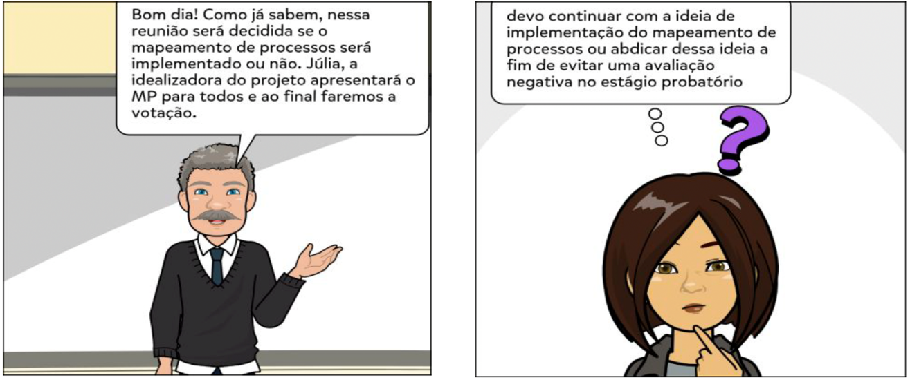 Dilema: Diante da situação, Júlia precisa decidir entre prosseguir com a ideia da implementação do mapeamento dos processos e correr o risco de reprovar em estágio probatório ou desistir da implementação, mas afetando o setor. Instalado o conflito, Júlia necessita tomar decisões.