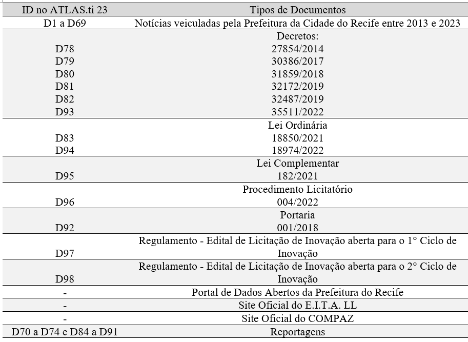 Sendo assim, a análise foi baseada em notícias veiculadas no portal oficial da PCR entre 2013 e 2023; matérias publicadas em jornais de circulação local e nacional que tratassem especificamente dos casos em questão; decretos municipais; leis ordinárias; sites institucionais oficiais do E.I.T.A Recife e do COMPAZ; e, portal de dados abertos do Recife. Esses documentos foram inseridos no ATLAS.ti 23 com o intuito de possibilitar uma análise mais aprofundada dos pesquisadores.