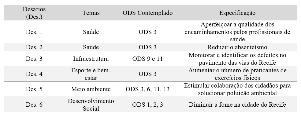 Os temas elencados se referem a problemas vivenciados pelos cidadãos, definidos a partir de reuniões com participantes das diversas secretarias da Prefeitura, que pontuaram as principais dores da cidade, gerando um Banco de Oportunidades, posteriormente utilizado como fonte na definição dos desafios. O ODS 3, ligado à saúde (UN, 2015), esteve presente em 5, dos 6 desafios (ver Tabela 2). E 3, dos 4 projetos efetivados, atenderam e esta ODS.