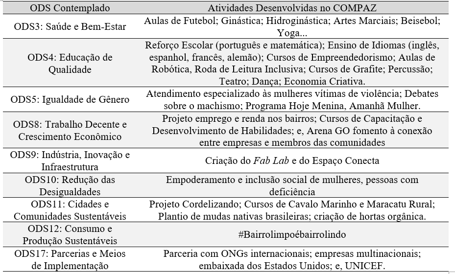 Ao longo dos anos o COMPAZ se desenvolveu como um equipamento capaz de fornecer à população mais vulnerável oportunidades de capacitação profissional (D10; D19; D32; D35; D39; D48; D59; D64; D66; D69), desenvolvimento intelectual e esportivo (D8; D10; D17; D19; D26; D28; D32; D45), fomento à inclusão social de mulheres e de pessoas com deficiência (D4; D7; D14; D15; D30; D31; D33; D41; D43; D54; D68; D78), além de fomento à eventos que tratam da sustentabilidade (D37; D55). A Tabela 3 apresenta a relação de algumas atividades desenvolvidas no COMPAZ com os ODS.