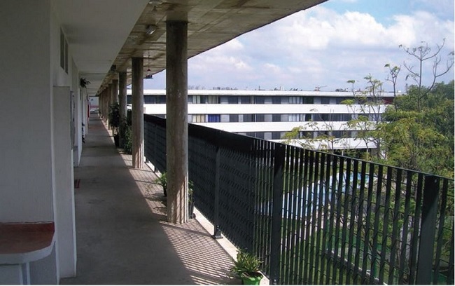 Ainda sobre o corredor, o fechamento do perímetro externo não seria realizado com o guarda‑corpo metálico, mas com elementos cerâmicos vazados, que teriam a altura do pé‑direito do corredor. Além de outros resultados estéticos e de alterações na própria volumetria da edificação, elas seriam capazes de proteger as paredes dos apartamentos contra o excesso de insolação, criando, inclusive, outras privacidades aos seus usuários. Essa proteção se confirma na prática, pois o sol poente estaria defronte a diversos apartamentos dispostos para o pátio central. Esse é um expediente que, senão inventado, grandemente aperfeiçoado durante décadas em solo brasileiro, utilizado em edifícios de apartamentos paradigmáticos, como os projetados por Lúcio Costa ao redor do Parque Guinle, bairro de Laranjeiras, Rio de Janeiro. Mais uma vez, as intenções projetuais foram frustradas pelas imposições da COHAB, que preferiu não adotar os elementos sugeridos. De todo modo, o elemento metálico vazado de meia‑altura certamente ampliou a visibilidade do gramado à frente e gerou outras integrações com o entorno.