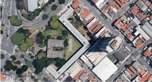 A implantação do edifício no terreno e a relação espacial com o entorno também suscitam questões sobre a integração socioespacial com a vizinhança (Figura 6). Um exame desatento da implantação do conjunto pode concluir que o edifício habitacional e o prédio de uma biblioteca municipal estão inseridos na mesma área verde. Nessas circunstâncias, moradores do conjunto e usuários da biblioteca, além de transeuntes, teriam a opção de transpor livremente ou permanecer na área comum do conjunto‑biblioteca. A forma geral da planta do edifício da Vila dos Idosos, em L, sugere uma ocupação perimetral do terreno. O Conjunto contorna as instalações da biblioteca pública, criando uma área comum, vazia e sem edificações, um pátio entre os dois edifícios. No trecho entre a biblioteca e o conjunto, na região do espelho d’água, haveria um ambiente pretensamente mais intimista, aberto e de livre acesso, porém visualmente protegido, já que boa parte desse ambiente está fechado pelas fachadas dos dois edifícios.