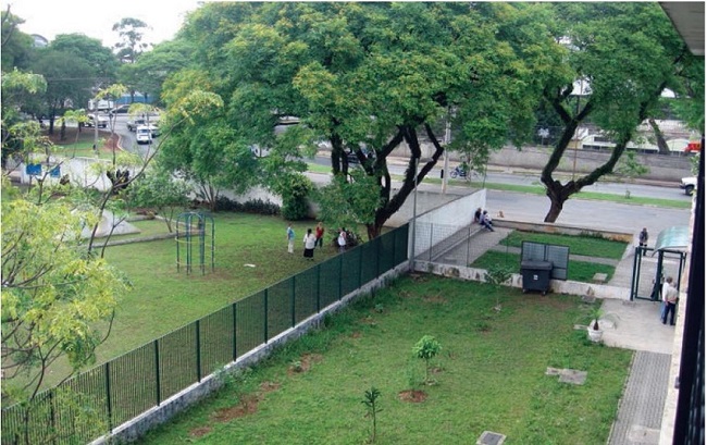 Complementarmente, nas áreas descobertas, também foram projetados ambientes com qualidades paisagísticas e que permitem interações entre os moradores. No pátio central, por exemplo, existe uma grande área gramada, com algumas árvores e um espelho d’água. Todos que chegam pela entrada principal do Conjunto transitam por esse espaço. Além da vegetação, na fachada posterior que divisa com terrenos vizinhos, há um jardim linear ocupando toda a extensão do edifício onde foi prevista a construção de uma horta comunitária (Figura 5). Sobre a horta, para o auxílio do plantio das hortaliças, a COHAB disponibiliza um técnico agrícola, que orienta os idosos em atividades como o manejo da terra, o cultivo dos grãos, o eventual uso de adubos, a colheita dos vegetais, legumes ou frutas, o uso de sementes etc. Atualmente, todo o espaço destinado para a horta está ocupado com uma grande variedade de plantas. Supõe‑se que esses alimentos contribuam na dieta e na economia dos idosos, além de significar importante atividade laboral e mental, que demanda trabalho comunitário.
