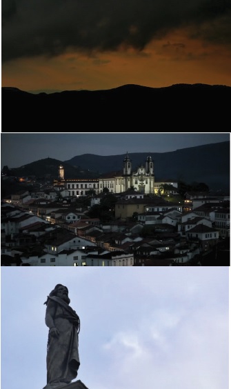 Anoitece em Vila Rica2 . Nuvens rapidamente escondem aquilo que não deve ser visto. Luzes se acendem, monumentos erguem-se na paisagem. O mártir Tiradentes permanece impassível. Apenas os fantasmas aparecem (Figura 1).