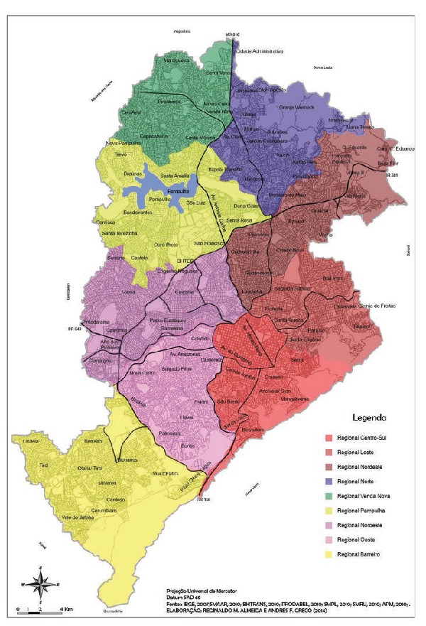 Verifica-se, na Figura 2, que entre os anos de 1996 a 2010, os parcelamentos do solo ocorreram no meio da malha urbana parcelada da cidade, nas regiões Sul e, principalmente, Norte de Belo Horizonte. Observa-se ainda, parcelamentos como o Belo Horizonte Centro Tecnológico (BHTEC) - concepção que simboliza a tentativa da cidade de se inserir no mercado tecnológico globalizado; o parcelamento Granja Werneck - concepção destinada à classe média/alta, ou seja, uma megaprodução capitalista da produção do espaço em Belo Horizonte; o do Programa Minha Casa Minha Vida (PMCMV); o parcelamento Bairro Vitória II - concepção que consiste em uma velha estratégia de atender as demandas de habitação de interesse social na periferia da cidade; e o da Cidade Administrativa, sede das Secretarias do Estado de Minas Gerais, ao longo da MG-010.