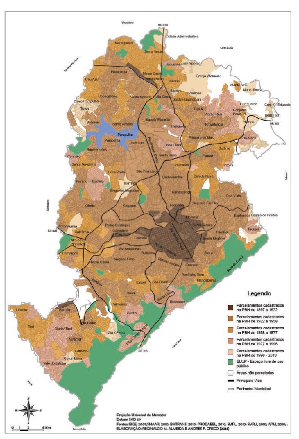 A Figura 2, elaborada a partir de diversas Plantas Cadastrais e dados da Prefeitura de Belo Horizonte, indica as expansões urbanas da cidade, entre 1897 e 2010, na modalidade de parcelamentos do solo. Consideraram-se como expansão urbana, os parcelamentos regulares, os irregulares e os clandestinos cadastrados até 2010, que podem conter áreas não loteadas, e também as áreas de vilas e favelas que também já estão cadastradas. Destaca-se na Figura 2 as “Áreas não parceladas” indicadas pela cor branca. Essas áreas estão desocupadas, não possuem infraestrutura urbana e projetos de parcelamentos cadastrados na Prefeitura de Belo Horizonte. As áreas definidas pela cor verde, referem-se aos Espaços Livres de Uso Público (ELUP), definidas pela LPOUS municipal como áreas de praças e parques.
