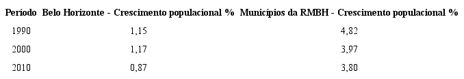 A cidade de Belo Horizonte, com taxas decrescentes de crescimento populacional, já no final do Século XX, deixou de ser o núcleo de concentração do crescimento populacional na RMBH, que passou a ser conduzido por municípios periféricos. Observa-se que, de acordo com o Censo (Quadro 1), a taxa de crescimento de Belo Horizonte, em 2010, foi inferior a um ponto percentual ao ano, enquanto nos demais municípios da Região Metropolitana de Belo Horizonte (RMBH) as taxas mantiveram-se acima de três pontos percentuais.