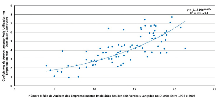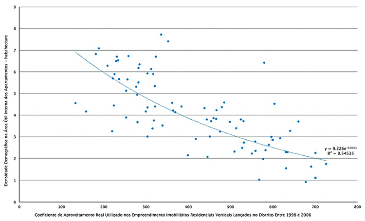 Tendo em mente todas aquelas ponderações, vale observar a Figura 1, na qual se pode observar claramente a relação inversa entre a densidade demográfica na área útil interna dos apartamentos inseridos nos empreendimentos imobiliários residenciais verticais lançados no município de São Paulo, entre 1998 e 2008. Percebe-se que aquela densidade demográfica diminui enquanto aumenta a densidade construtiva daqueles empreendimentos, apresentada por meio do coeficiente de aproveitamento conforme definições e ponderações apresentadas anteriormente.