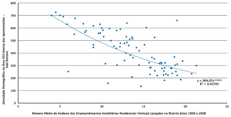 A Figura 2 mostra que, junto com parte da densidade construtiva, o padrão de verticalização produzido recentemente nos espaços urbanos paulistanos também é oco evidenciando a dissociação entre esse padrão e a densidade demográfica. Nota-se que o aumento no número médio de andares dos empreendimentos imobiliários residenciais verticais, lançados entre 1998 e 2008, no município de São Paulo, é acompanhado pela diminuição da densidade demográfica na área útil interna dos apartamentos inseridos naqueles empreendimentos.