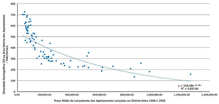 Possivelmente, a “cidade oca” encontra-se nos empreendimentos imobiliários residenciais verticais destinados às camadas de mais alta renda da sociedade paulistana. Isso porque, conforme se pode observar na Figura 4, os apartamentos inseridos naqueles empreendimentos, lançados entre 1998 e 2008, no município de São Paulo, com maiores preços de lançamento são, também, os que apresentam as menores densidades demográficas em suas áreas úteis internas.