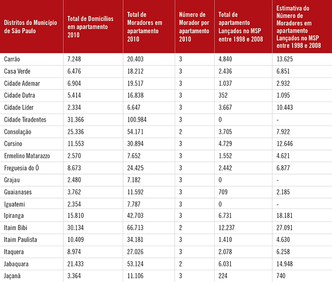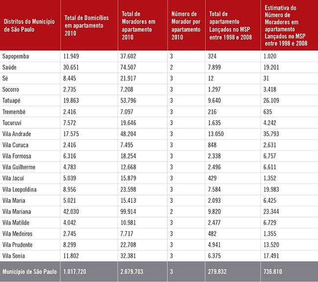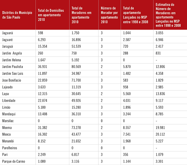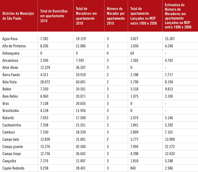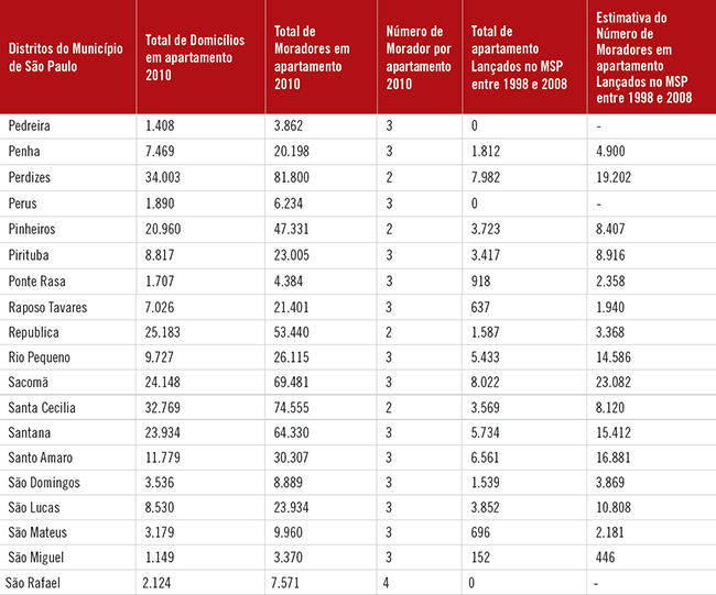 Em segundo lugar multiplicou-se aquele número pelo total de apartamentos lançados nos distritos do município de São Paulo, entre 1998 e 2008. Com isso, obteve-se a estimativa do total de moradores daqueles apartamentos segundo esses distritos, conforme a Tabela 1.