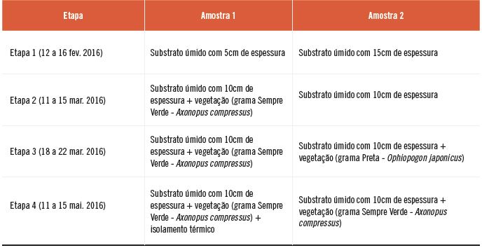 O isolante térmico utilizado na Etapa 4 foi poliestireno extrudado - XPS 25mm, o qual foi colocado entre o componente estrutural e a impermeabilização. A camada vegetal adotada nas duas amostras dessa etapa foi do tipo gramínea (grama Sempre Verde) por ser uma solução economicamente viável e de fácil aplicação.