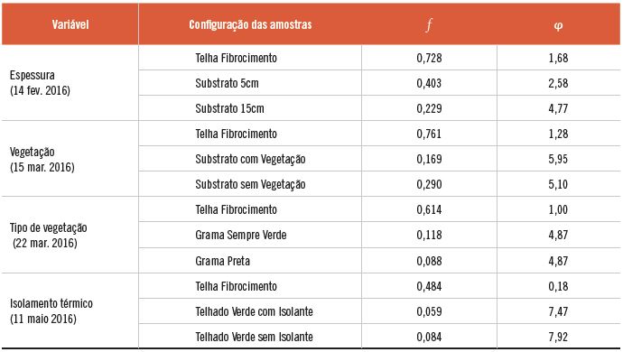 Os parâmetros Fator Decremental (f) e Atraso Térmico (φ) foram aplicados em cada etapa de medição como método de avaliação da capacidade de armazenamento de calor do telhado verde. Os resultados apresentados na Tabela 2 referem-se ao dia em que foi registrada a maior temperatura do ar externo, em cada etapa de medição.