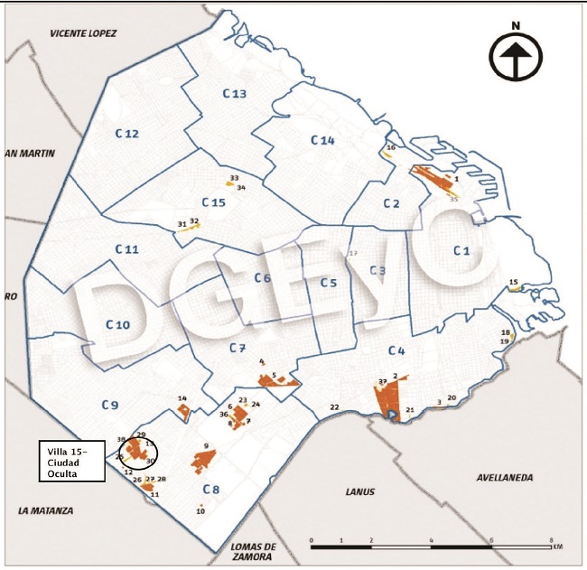 Villa 15, o más comúnmente denominada Ciudad Oculta4, se ubica en el barrio de Lugano (Comuna 8) y es una de las villas más grandes de la CABA. Está compuesta por 37 manzanas y ocupa 34 hectáreas, aproximadamente, de propiedad nacional, municipal y privada (Figura 1).