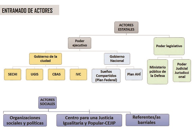 Identificamos, en primer lugar, organismos del poder ejecutivo del GCBA con competencias en las políticas de vivienda y villas - SECHI, UGIS, IVC, Corporación Bs.As. Sur (CBAS) -. En segundo lugar, el Gobierno Nacional, quien mediante distintas instituciones desarrolla diversas líneas de acción y programas (en el caso de estudio el Plan AHÍ y el proyecto Sueños Compartidos). Por último, reconocemos actores estatales vinculados al Poder Judicial de la ciudad (Defensoría del Pueblo de la Ciudad, Ministerio Público de la Defensa y sus Defensorías) que, en este caso, intervienen a partir de la judicialización de dos conflictos puntuales (el caso del Elefante Blanco y el desalojo de Nuevos Asentamientos).