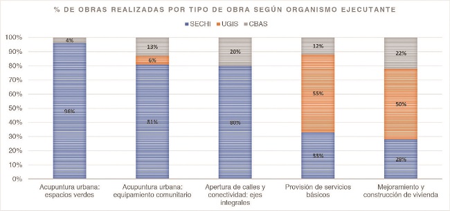 En Villa 15 se reproduce la tendencia general. En el período de análisis se realizaron en total 12 obras10, no contenidas en un proyecto de urbanización integral. La SECHI realizó la mayor cantidad de intervenciones (8), en su mayoría (5) de Acupuntura Urbana-Espacios Verdes. A la vez, la UGIS realizó 4 intervenciones de “Provisión de servicios básicos” y la CBAS solo una obra de “Acupuntura Urbana-Espacios verdes”.