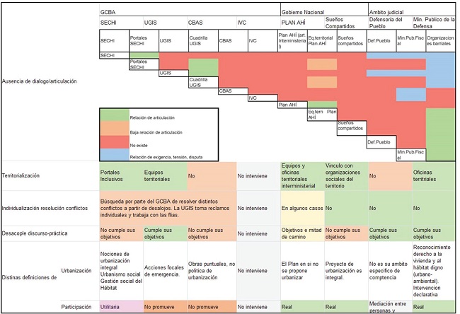 En primer lugar, las articulaciones institucionales se dan de modo complejo debido a la estructura estatal y a la diversidad de lógicas y modus operandi existentes. Por un lado, se evidencia un desacople entre las sentencias del Poder Judicial y la capacidad de brindar soluciones del Poder Ejecutivo. Al salir de los tribunales, las soluciones son resignificadas por el Poder Ejecutivo en función de la lógica de la intervención pública existente. Por otro lado, en este período se profundizan las tensiones y desarticulaciones entre los diferentes actores estatales debido a la coexistencia de gobiernos de distinto signo político, generando vacíos de acción y/o obturando el desarrollo de ciertas iniciativas (disputas por las competencias en torno al Elefante Blanco, la inacción vinculada a servicios por problemas de dominio, la realización de un proyecto de urbanización, etc.). Dentro de la misma esfera de gobierno, identificamos dos modelos de articulación diferenciados en el diseño, o no, de estructuras institucionales que lo habiliten. Por un lado, el caso del GCBA, donde discursivamente se le asigna a la SECHI el rol de organismo coordinador, pero no existen articulaciones institucionales. Por el otro, el Plan AHÍ donde se desarrollan espacios de articulación que habilitan el diálogo entre los distintos niveles de gobierno - reuniones de ministros, mesas de equipos territoriales y trabajo cotidiano coordinado -, habilitando una mirada más integral.
