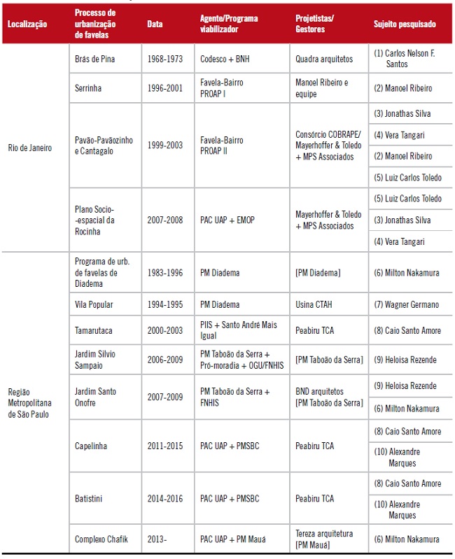 Como casos, foram selecionados para este estudo um grupo de sujeitos (arquitetos projetistas) que pudesse demonstrar a possibilidade de correlação entre práticas que se identificavam como referência militante, nos termos já colocados, para a intervenção em favelas. Arquitetos com mais de 10 anos de experiência prática em projetos de urbanização de favelas e, sempre que possível, também em obra. A ideia inicial foi a de estabelecer uma relação entre casos distintos com a participação de cada projetista para, na comparação entre eles, compreender as motivações, condicionantes, adaptações, transformações e opiniões sobre os processos e seus resultados. Este panorama teve como intuito encontrar uma reflexão por um lado, sobre o conhecimento acumulado em urbanização de favelas e por outro, sobre a situação atual dos arquitetos projetistas perante a mesma.