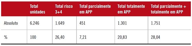 Para melhor compreensão da realidade das comunidades denominadas Diretamente Beneficiadas - que somam 6.337 unidades habitacionais (17.703 moradores) -, foi realizado um mapeamento, com a inserção digital das projeções das casas, uma a uma, a partir de foto aérea, sobre a base do Mapa Digital da Cidade (PREFEITURA DE SÃO PAULO, 2013), inserindo as favelas na cartografia oficial da cidade. Foram mapeados ainda os espaços livres (becos, vielas e “praças”) e áreas vegetadas. Sobre esse mapeamento foram registradas as áreas de risco, segundo levantamento oficial elaborado pelo Instituto de Pesquisas Tecnológicas da Universidade de São Paulo (IPT/USP) - Riscos 1 a 4 -, e as “faixas não edificáveis” ao longo de corpos d’água, segundo parâmetros estabelecidos pelo Código Florestal e pela Lei n° 11.977/09 (Programa Minha Casa Minha Vida) - que inaugura a possibilidade de regularização, desde que de forma fundamentada, de ocupações em Áreas de Preservação Permanente (APP’s), no meio urbano e em casos de interesse social. Ambas as informações (Risco e APP’s) costumam ser ponto de partida para a estimativa dos índices de remoção pelos órgãos oficiais. Por fim, foram diagramados sobre a base os seguintes dados por domicílio/família10: tipo de uso do imóvel, tipo de situação (imóveis ocupados ou vazios), regime de ocupação (propriedade), material construtivo predominante, ligações de luz, água e esgotamento sanitário, coleta de resíduos sólidos, grau de instrução de chefe de família, situação de trabalho e renda familiar (Tabela 1).