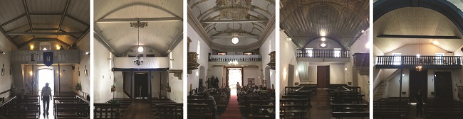 Nas capelas a austeridade se desdobra para a relação entre as paredes e o forro, onde estão expressas as pinturas. Estes, geralmente curvados, denotam a precariedade da solução estrutural pela exposição das barras horizontais de sustento da cobertura ou nas soluções de mitigar a chegada da abóbada nas paredes paralelas, haja visto o uso de rodatetos ou de facetamentos nas tábuas de madeira (Figura 6). Não obstante a modéstia do espaço, era no interior em que recaíam as exigências eclesiásticas: