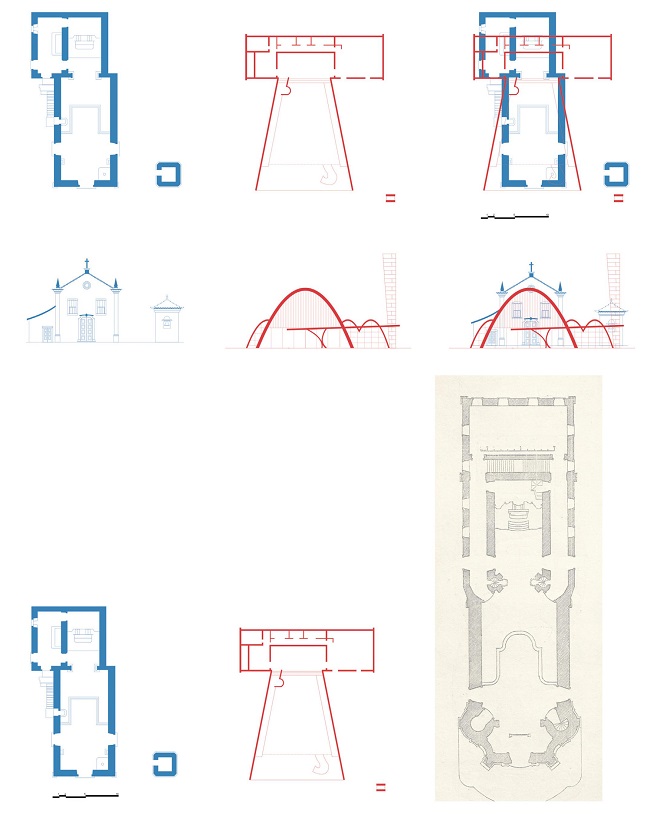 Essa premência de remontar ao desenho técnico para dar autoridade à construção histórica se torna problemática diante do cotejamento de duas obras francamente extemporâneas: como dar relações comuns a uma igreja do século XX e capelas da época do ciclo do ouro? Toma-se como referência analítica a contribuição de Colin Rowe e seu apelo às persistências tipológicas. Em seu conhecido “A matemática da Villa ideal”, o americano advoga pela busca de relações geométricas quintessenciais: “prédios que são, nas suas formas e evocações, superficialmente tão completamente distintos que cotejá-los parece risível”, escreveu Rowe, ponderando, “entretanto [que], se a intuição normal sugere isto, um estilo wölffliniano de exercício crítico [...] pode apelar primariamente àquilo que é visível [...] [e] ter o mérito de novas interpretações” (ROWE, 1989, p.3).