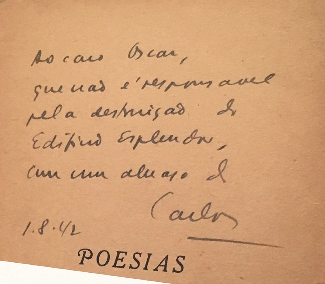 Niemeyer teve acesso ao poema já em 1942. Drummond lhe escreve uma dedicatória singela, que aparece como emblemático fechamento dos debates apresentados (Figura 8):