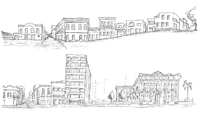 Na Figura 1 podem ser visualizados exemplos de cortes urbanos. Os cortes exploram potencialmente estes elementos da superfície urbana, apresentando as relações entre as edificações e a rua, entre o velho e o novo, entre espaço público e espaço privado, sem nunca deixar de apresentar a escala humana. Para Solá-Morales (2008, p.79, tradução nossa)6, "A redução sequencial, o corte da forma urbana, é um mecanismo de descrição e uma estratégia de projeto" pois é no corte urbano que pode ser notada a paisagem e a identidade urbana.