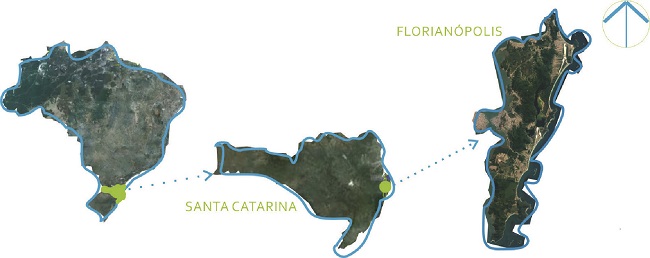 Florianópolis é a capital do estado de Santa Catarina. O município possui população de 485.838 habitantes (INSTITUTO BRASILEIRO DE GEOGRAFIA ESTATÍSTICA, 2017), e está localizado no litoral do estado (Figura 2). O recorte de estudo está localizado no bairro centro, delimitado com a criação de um raio de 300m a partir do mercado público, desse modo compreendendo um trecho importante da orla marítima e outros elementos que são relevantes para essa pesquisa, como a Praça XV de Novembro e a Igreja Matriz, o Museu Cruz e Souza, o Trapiche Miramar e parte do aterro baía sul.
