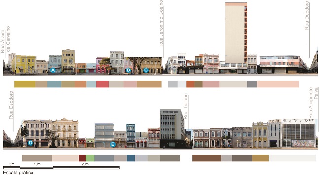 Em algumas construções destacam-se as pichações nas portas e paredes, que em determinados momentos se sobressaem à linguagem arquitetônica transmitida e rompem com as propriedades de conjunto pré-estabelecidas. Essa condição é notada principalmente na porção direita do corte, próximo à Praça XV de Novembro. Ainda assim, na análise da cor (Figura 4) nota-se que a variação cromática das elevações produz um efeito bastante atrativo, aliado ao alto nível de ornamentação das edificações Ecléticas. Entretanto, o mesmo não pode ser afirmado sobre as construções mais recentes, que possuem fachadas sóbrias e menos ornamentadas.