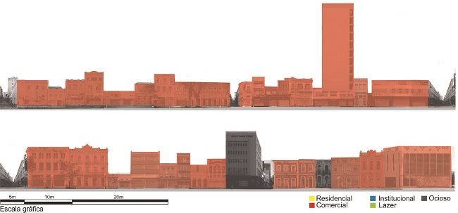 Como amálgama das leituras obtidas com a realização dos cortes urbanos, pode-se verificar a pouca variedade dos usos do solo, com predominância de atividades comerciais. As edificações em alinhamento com a frente dos lotes e a grande quantidade de aberturas voltadas para a rua favorece as atividades comerciais e a manutenção da relação entre espaço público e edificado.